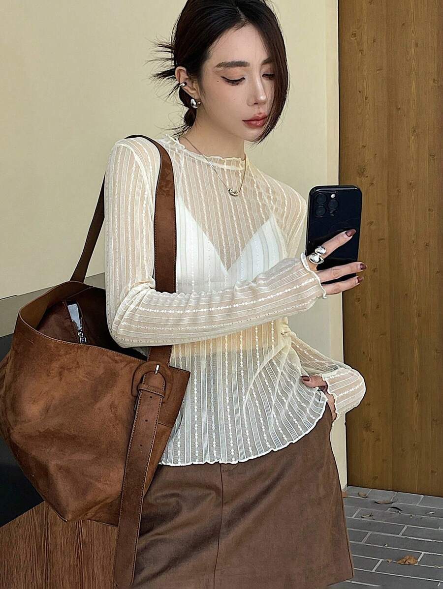 بلوزة نسائية شفافة بياقة مستديرة، بلوزات نسائية بأكمام طويلة