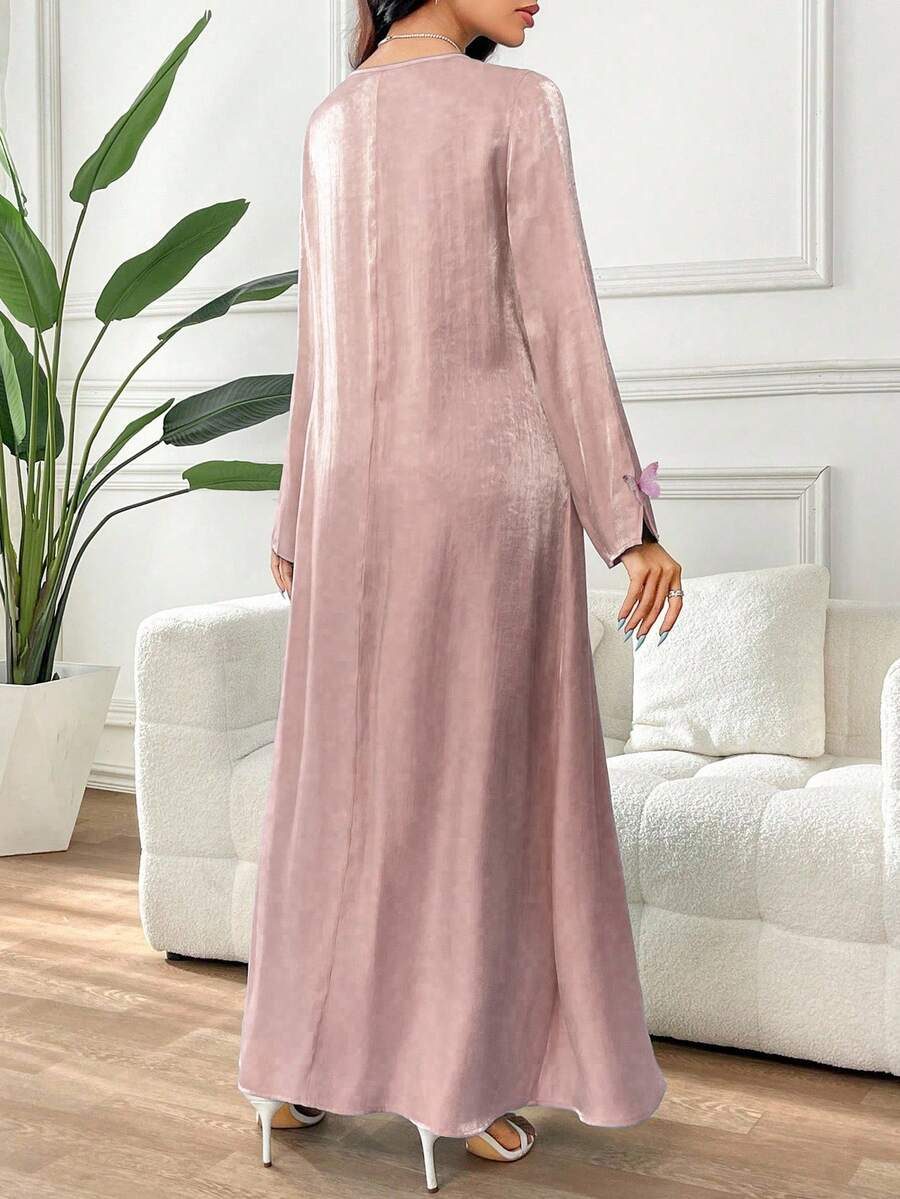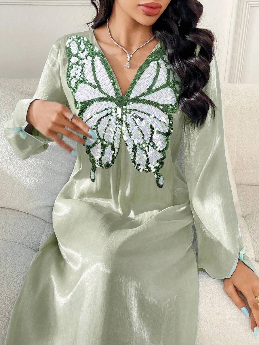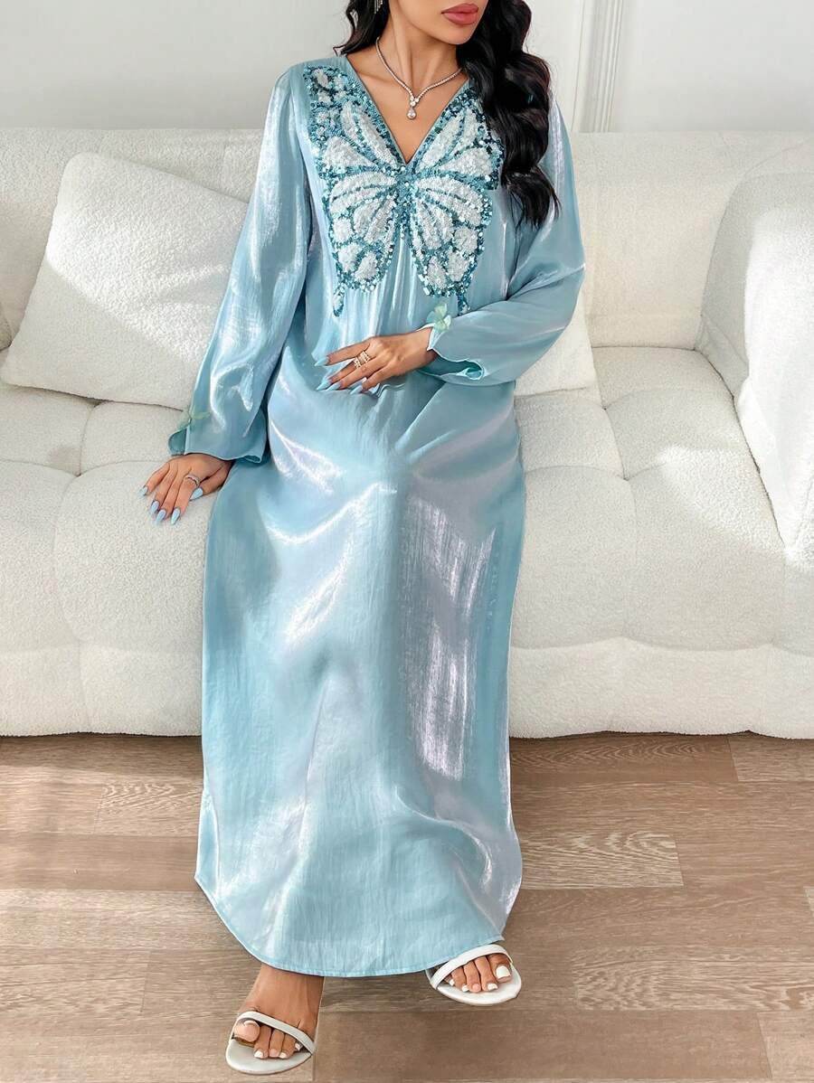 فستان أنيق للنساء بأكمام طويلة على شكل فراشة مطرز بترتر بياقة واسعة على الطريقة العربية