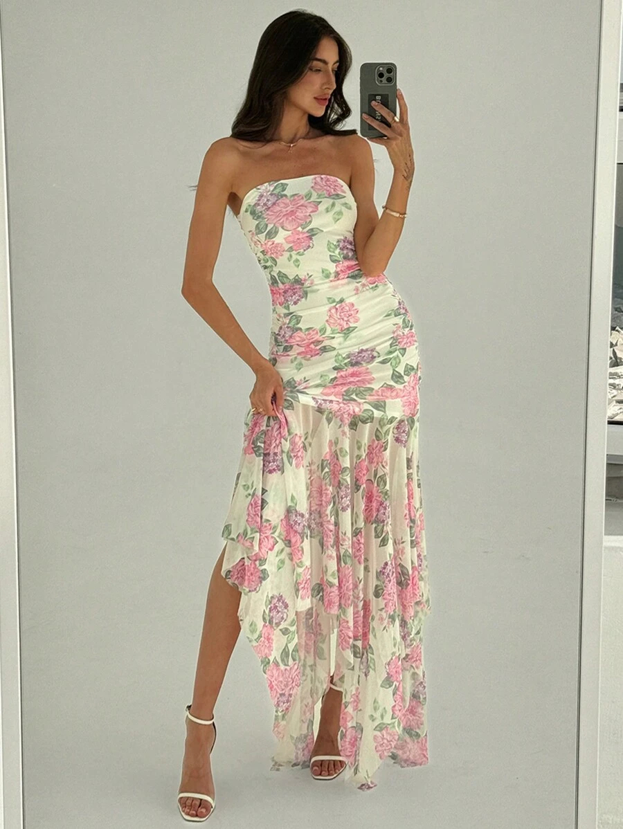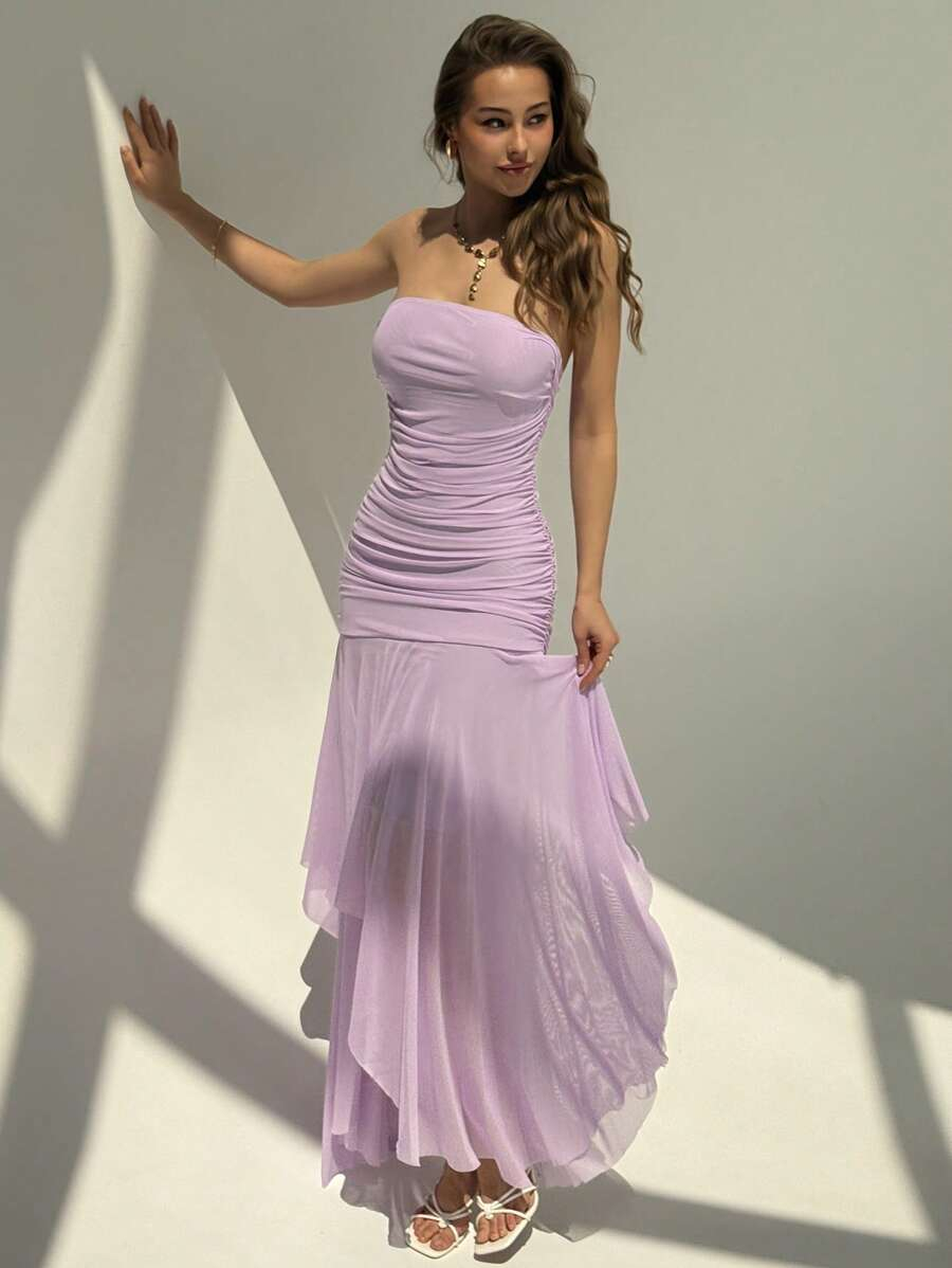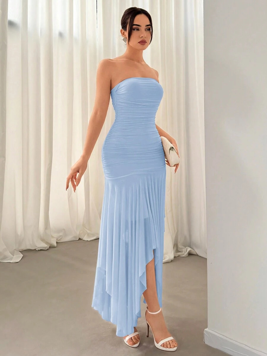 Aloruh فستان برقبة بلا أكتاف بحافة متساوية وكشكشة، مناسب للمواعيد وموسم الزفاف